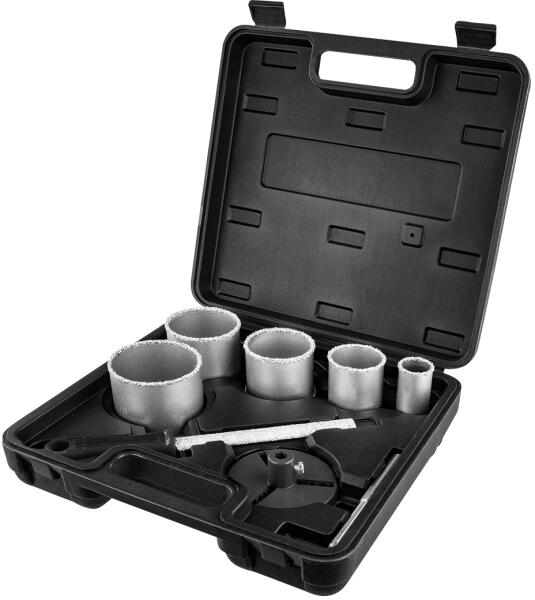 GRAPHITE 56T743 Körkivágó készlet volfrámkarbid éllel, 33-83 mm, 8db-os. Téglában, üreges blokkban, pórusbetonban, gipszkartonban és könnyűszerkezetű építőanyagokban való használatra tervezték. Magasságuk 68 mm, fúrási mélységük 57 mm. 33, 53, 67, 73, 83 mm-es átmérőjű elemekkel, befogótárcsával és központfúróval. Maximális fordulatszáma 1200 rpm. A fúrt felületek egyszerű kézi finomításához egy praktikus volfrámkarbid reszelő is tartozik a csomaghoz. Bármilyen szerelési munkához használható, például, szerelvénydobozok, szereléséhez. Használható továbbá szellőzőcsövek konyhában, fürdőszobában lévő ventilátorok beszereléséhez. EAN: 5902062117939VTSZ: 8207509000