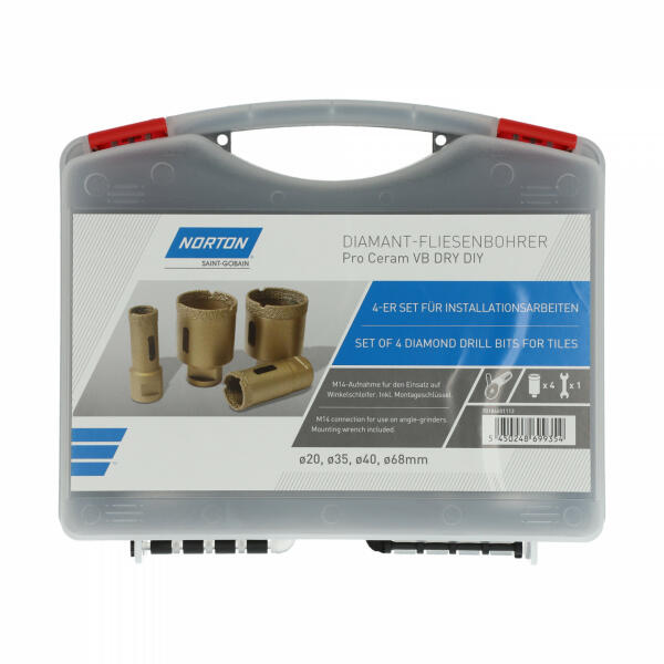 A Norton Clipper Extreme VB Dry vákuumforrasztott gyémánt fúrók kemény kerámialapok, természetes kő, márvány és gránit száraz fúrásához. Az M14 csatlakozó minden elterjedt sarokcsiszolóhoz alkalmas, és könnyű és tiszta fúrást tesz lehetővé. Kezdje el a fúrást 45 fokos szögben. Állítható fordulatszámú sarokcsiszoló használata javasolt. Száraz vágáshoz használjon alacsony sebességet. Magas fordulatszámon (pl. 11000 ford. /perc) vízhűtés javasolt. Hagyja a gyémánt fúrót enyhén oszcillálni, csak kis nyomást gyakoroljon és fúrás után vízzel hűtse le, egyébként minden furat után várja meg, amíg a szerszám kihűl.   MŰSZAKI ADATOK
